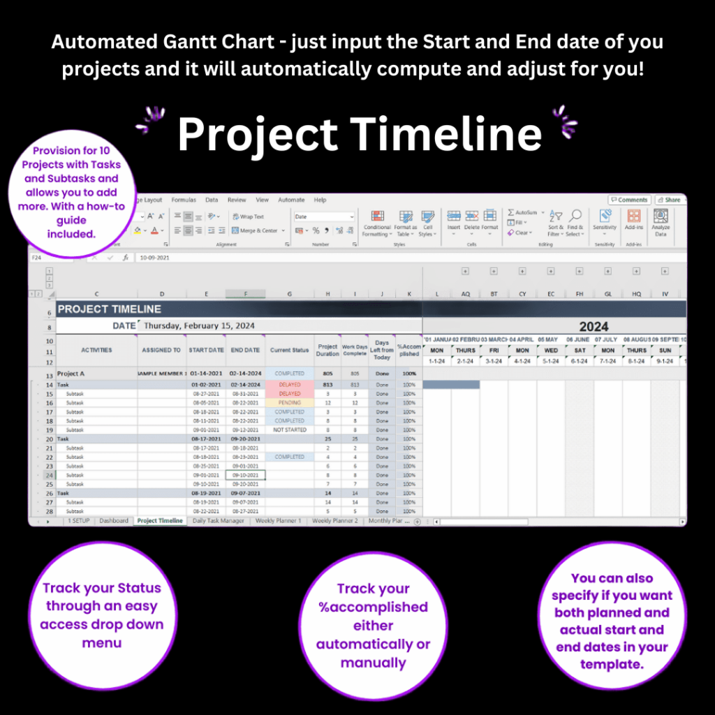 Requires minimal data input: Project Name, Assigned To, Start and End Date, Current Status. Automatically calculates Project Duration, Days Complete, Days Left, and % Accomplished.