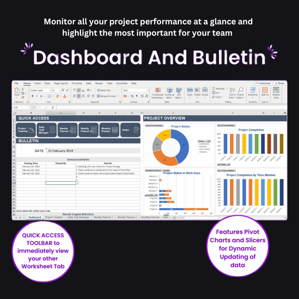 Easily monitor the status of all your projects. Provides a quick glance at the overall progress.